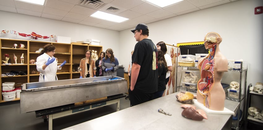 Students attending Rend Lake College's free Health Discovery Camp learn about human anatomy from Biological Sciences instructor Emily Jones.